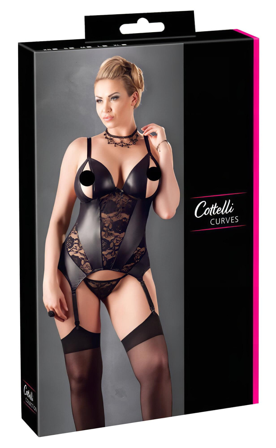 • Dizainas: Priekyje blizgi šlapio efekto medžiaga, nugaroje permatoma ir tampri, atvira krūtinės dalis, reguliuojamos petnešėlės ir kojinių diržai