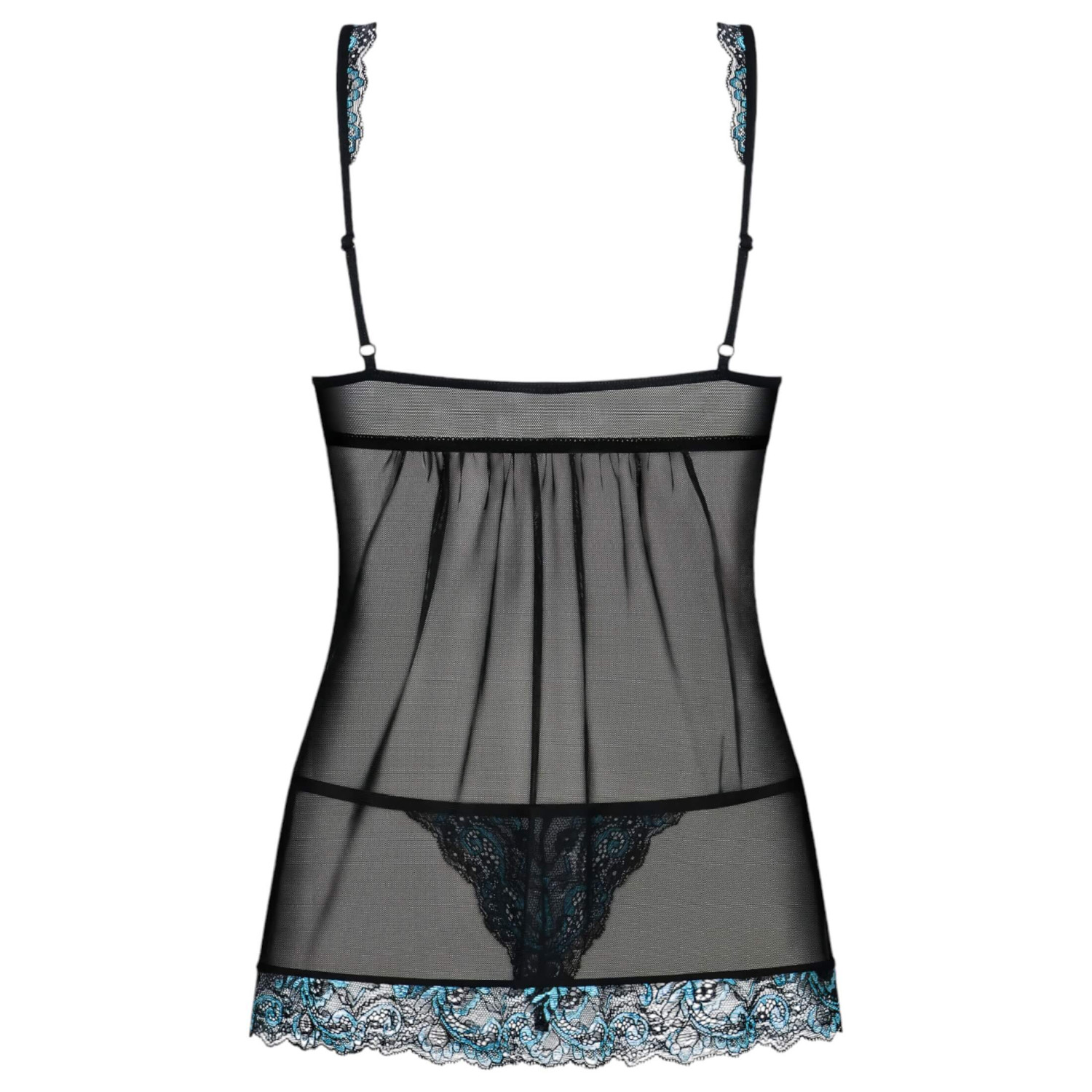 • 1 vnt. permatomas babydoll su turkio spalvos siuvinėtais nėriniais, reguliuojamomis petnešėlėmis, plastikiniu sagtuku ir atlasine juostele